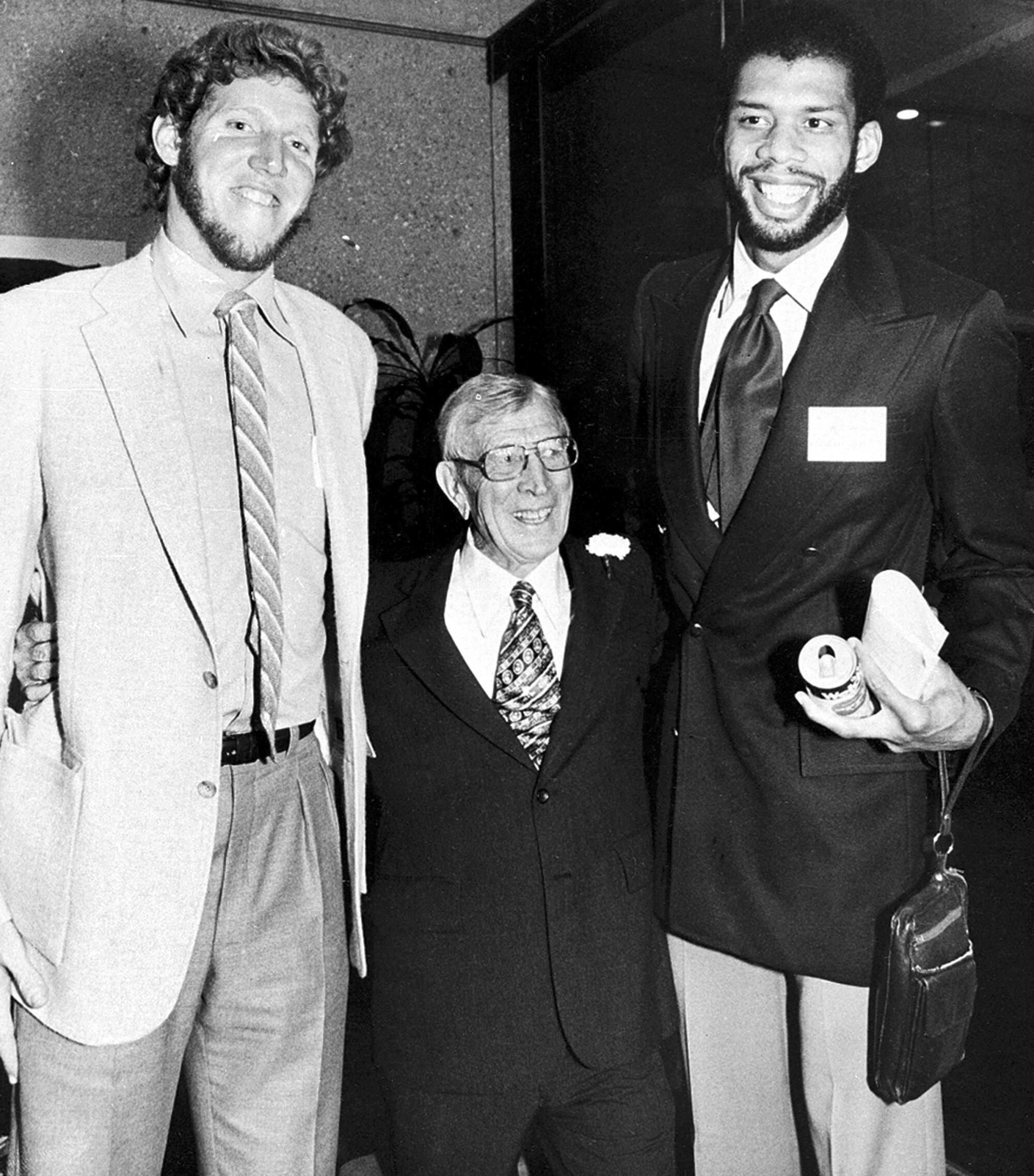Former UCLA coach John Wooden is flanked by UCLA alumni stars Bill Walton, left, and