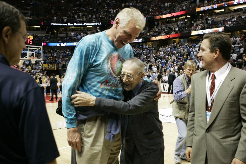 Visible from across any arena, the lumbering big man walked with a hitch in his stride in his later years but always enjoyed dispensing advice to young Bruins players before games and tossing T-shirts to students in the crowd. When fans called out his name inside Pauley Pavilion, Walton would raise both of his giant arms skyward in triumphant acknowledgement.