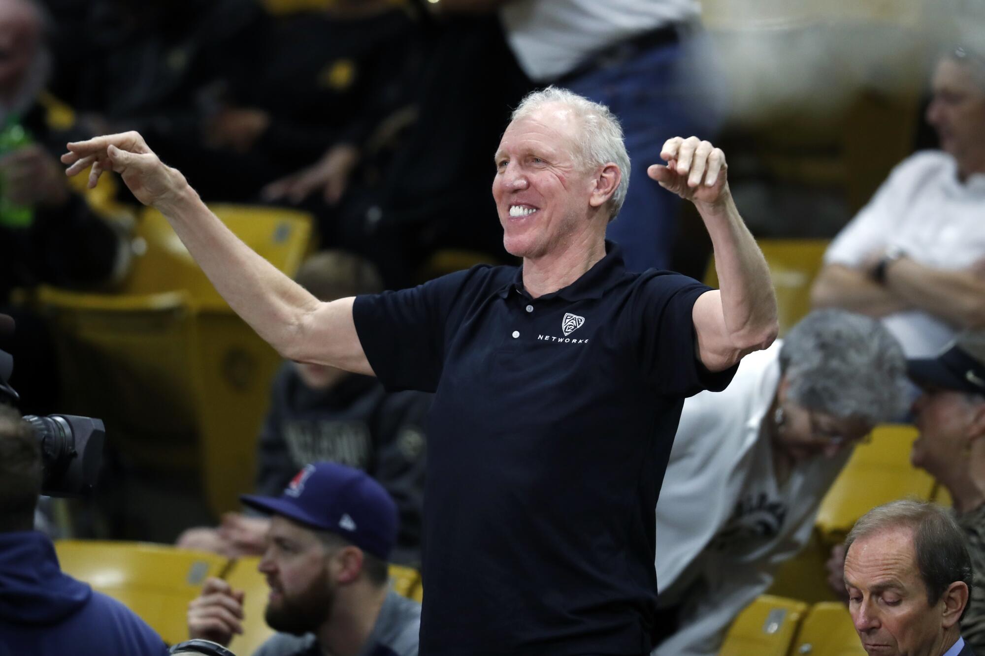 Bill Walton smiles as he acknowledges fans before broadcasting a Pac-12 basketball game.