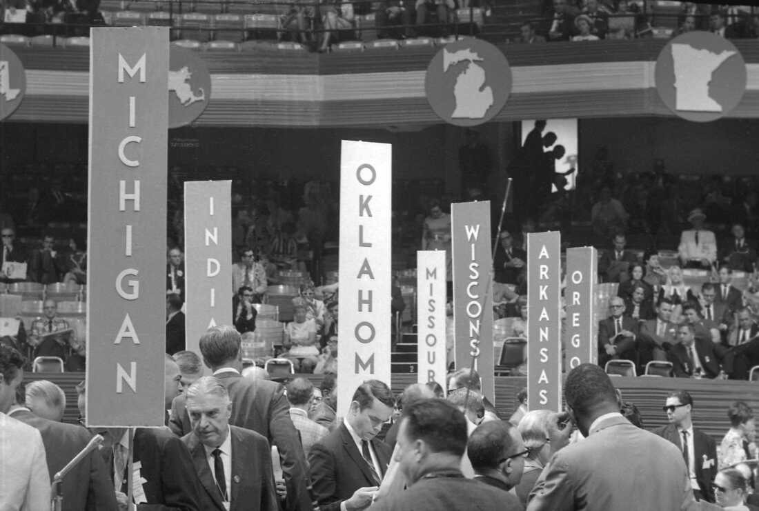 General view of the delegates from different states sit and stand during the 1968 Democratic National Convention, held at the International Amphitheatre in Chicago, Aug. 28, 1968.