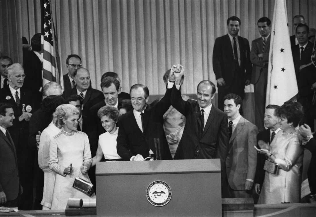 American politician Hubert Humphrey and defeated nominee, American politician George McGovern after Humphrey had been nominated as the 1968 presidential election on the final day